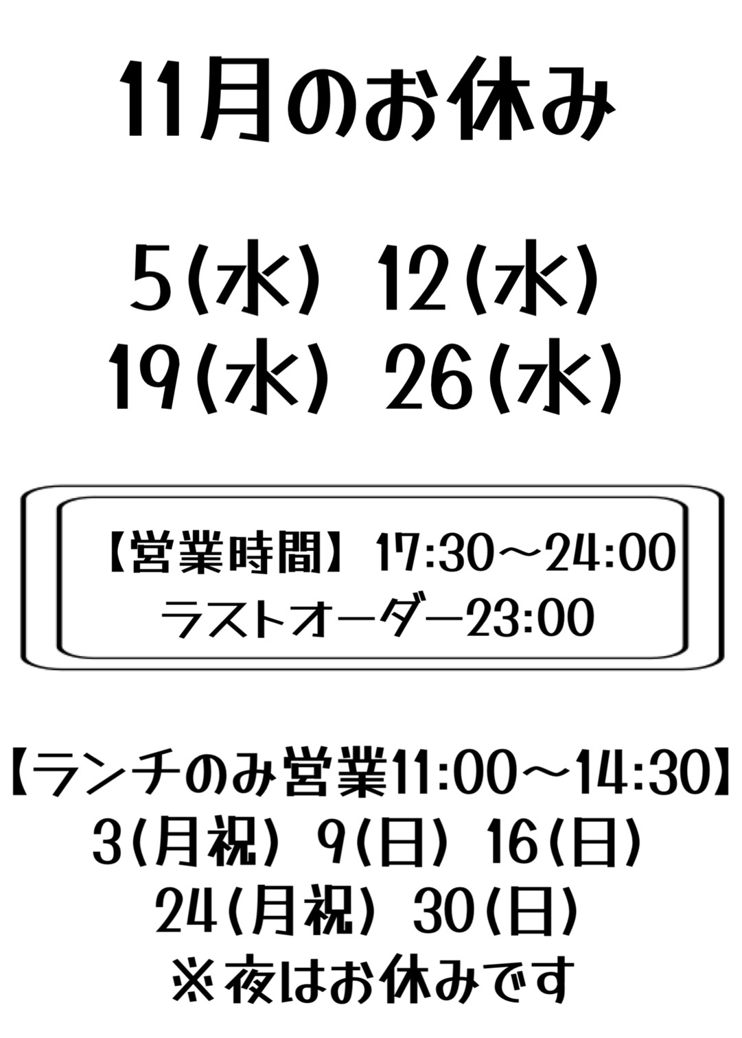 いつも沖縄奄美料理居酒屋「奄んちゅ」をご利用いただき、ありがとうございます。11月は上記画像のとおり休業日をいただきます。